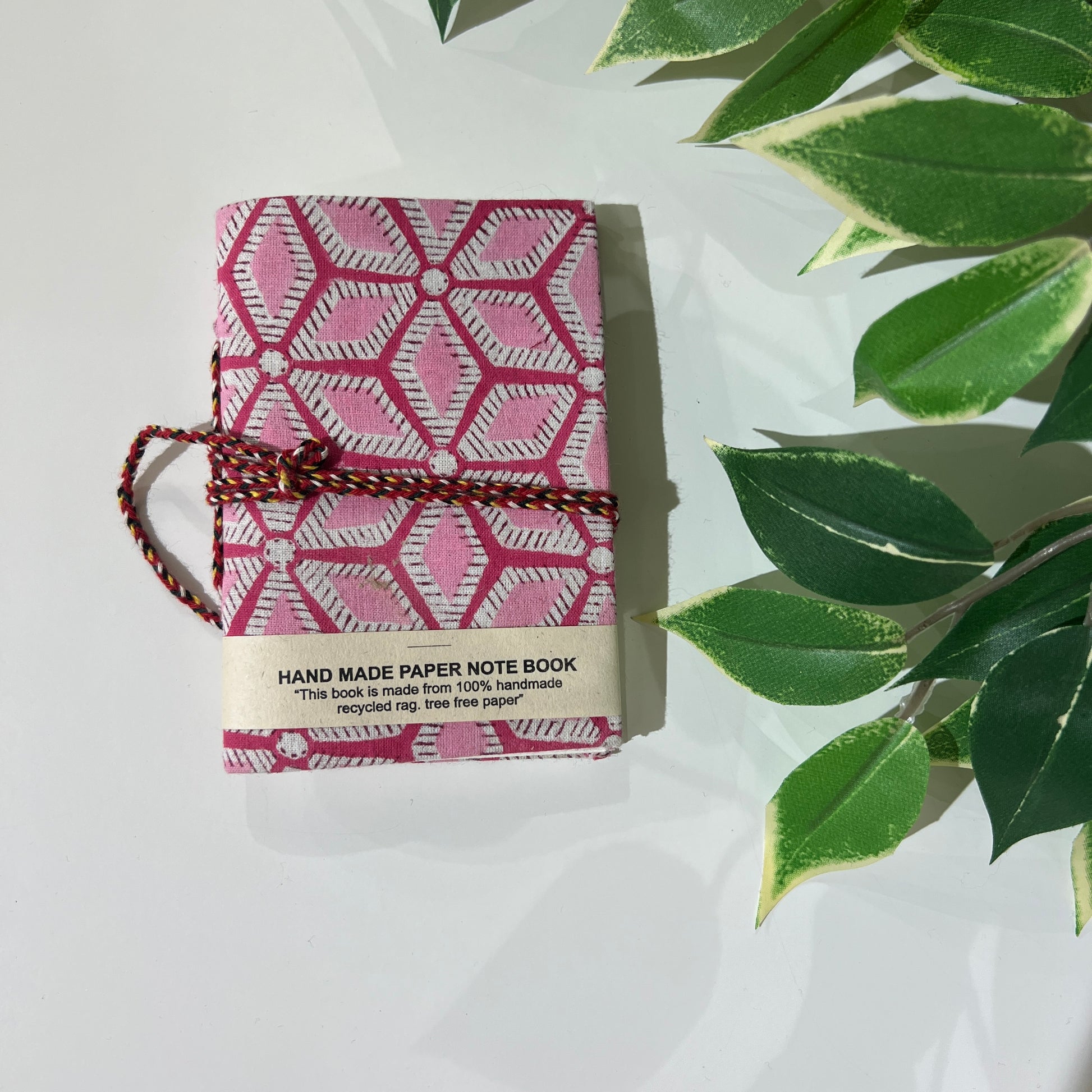 Estas libretas las traemos de la India, están hechas a mano con tela de algodón con estampado block print con tintes naturales. La tela puede tener alguna pequeña imperfección al ser el estampado hecho a mano. El papel es reciclado, también hecho a mano y contiene impurezas lo que le confiere un carácter especial y artesanal.