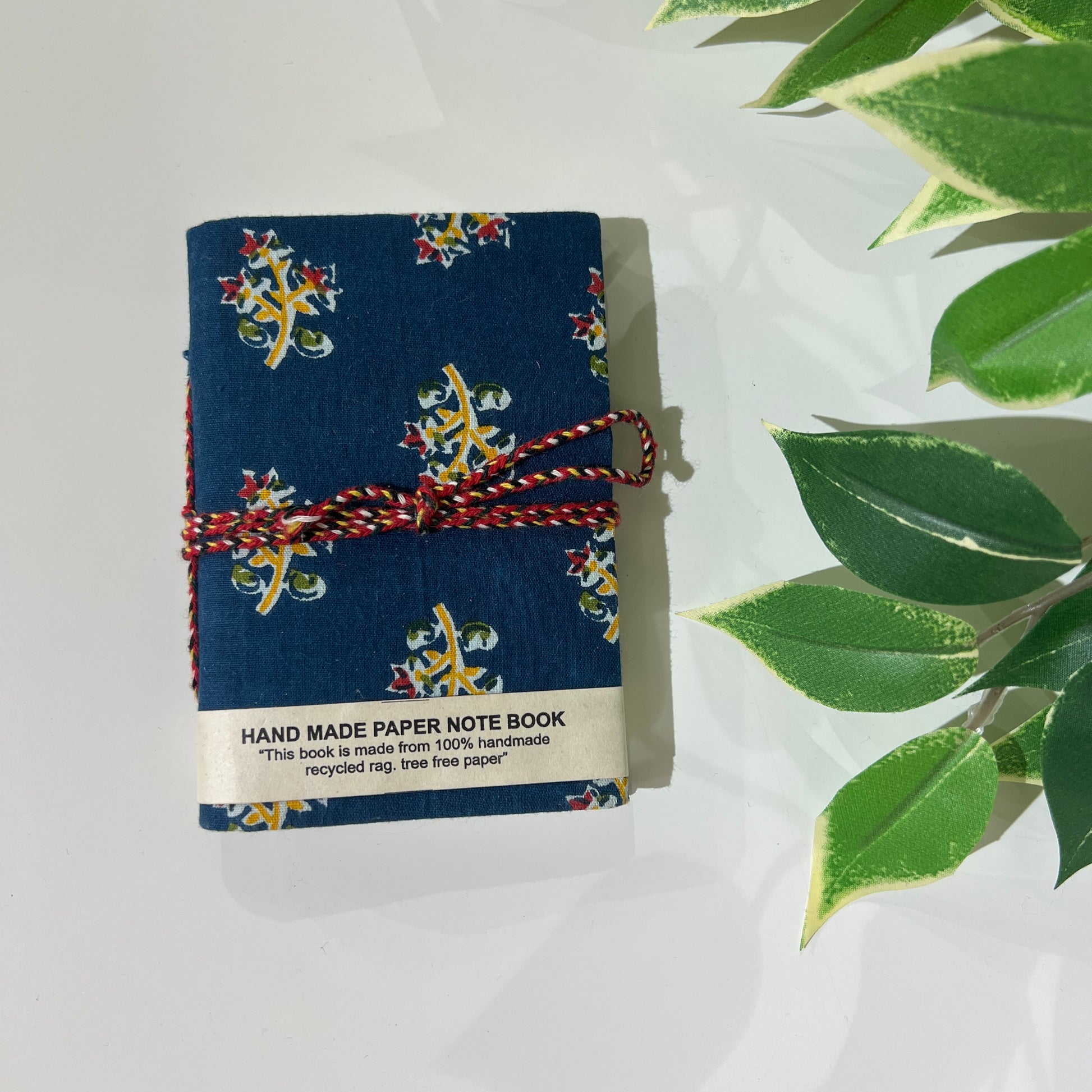 Estas libretas las traemos de la India, están hechas a mano con tela de algodón con estampado block print con tintes naturales. La tela puede tener alguna pequeña imperfección al ser el estampado hecho a mano. El papel es reciclado, también hecho a mano y contiene impurezas lo que le confiere un carácter especial y artesanal.