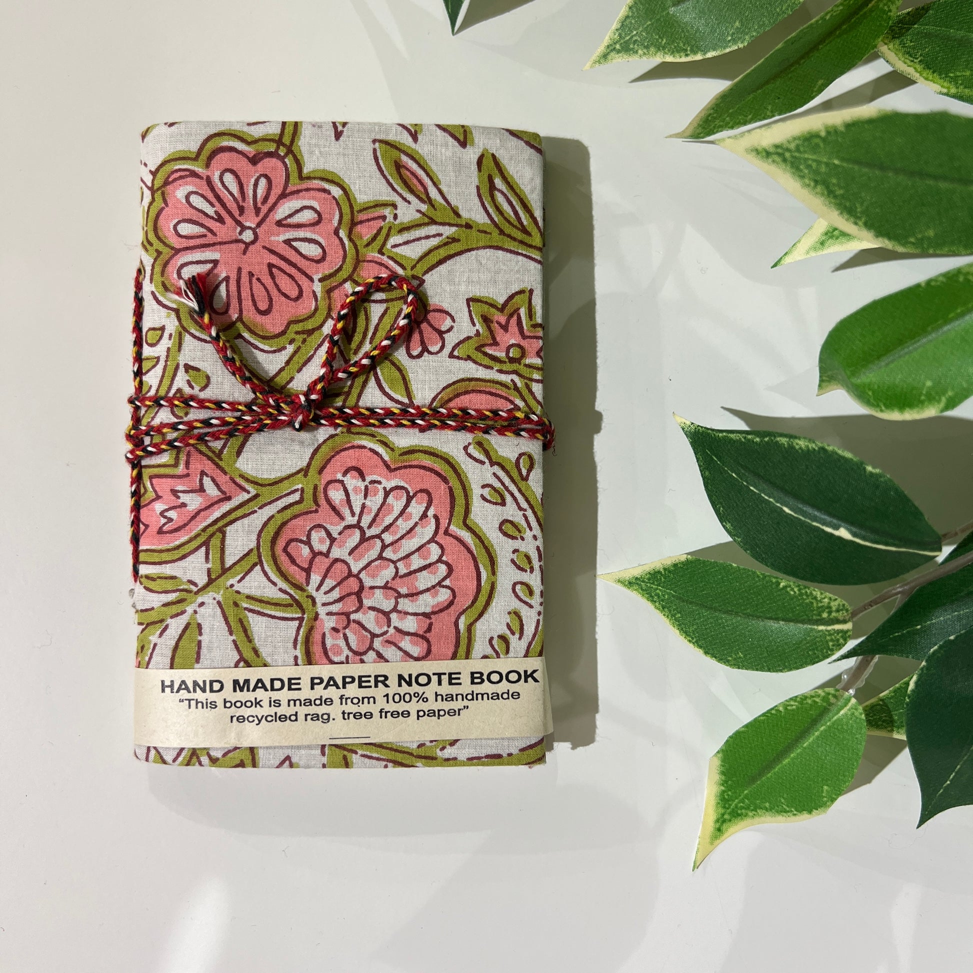Estas libretas las traemos de la India, están hechas a mano con tela de algodón con estampado block print con tintes naturales. La tela puede tener alguna pequeña imperfección al ser el estampado hecho a mano. El papel es reciclado, también hecho a mano y contiene impurezas lo que le confiere un carácter especial y artesanal.