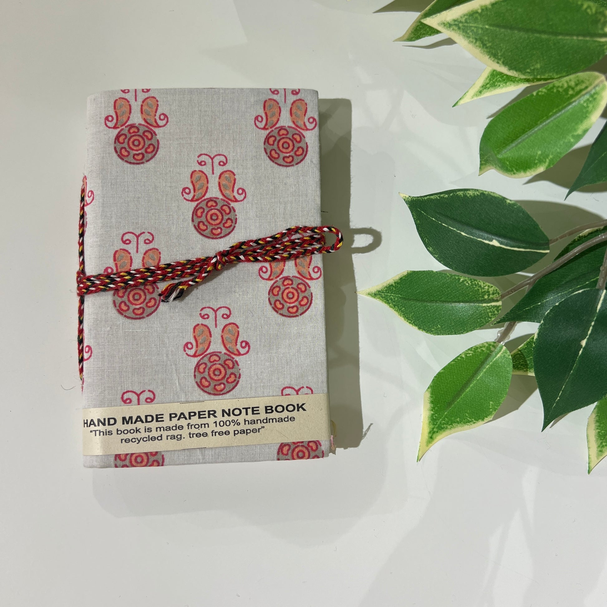 Estas libretas las traemos de la India, están hechas a mano con tela de algodón con estampado block print con tintes naturales. La tela puede tener alguna pequeña imperfección al ser el estampado hecho a mano. El papel es reciclado, también hecho a mano y contiene impurezas lo que le confiere un carácter especial y artesanal.