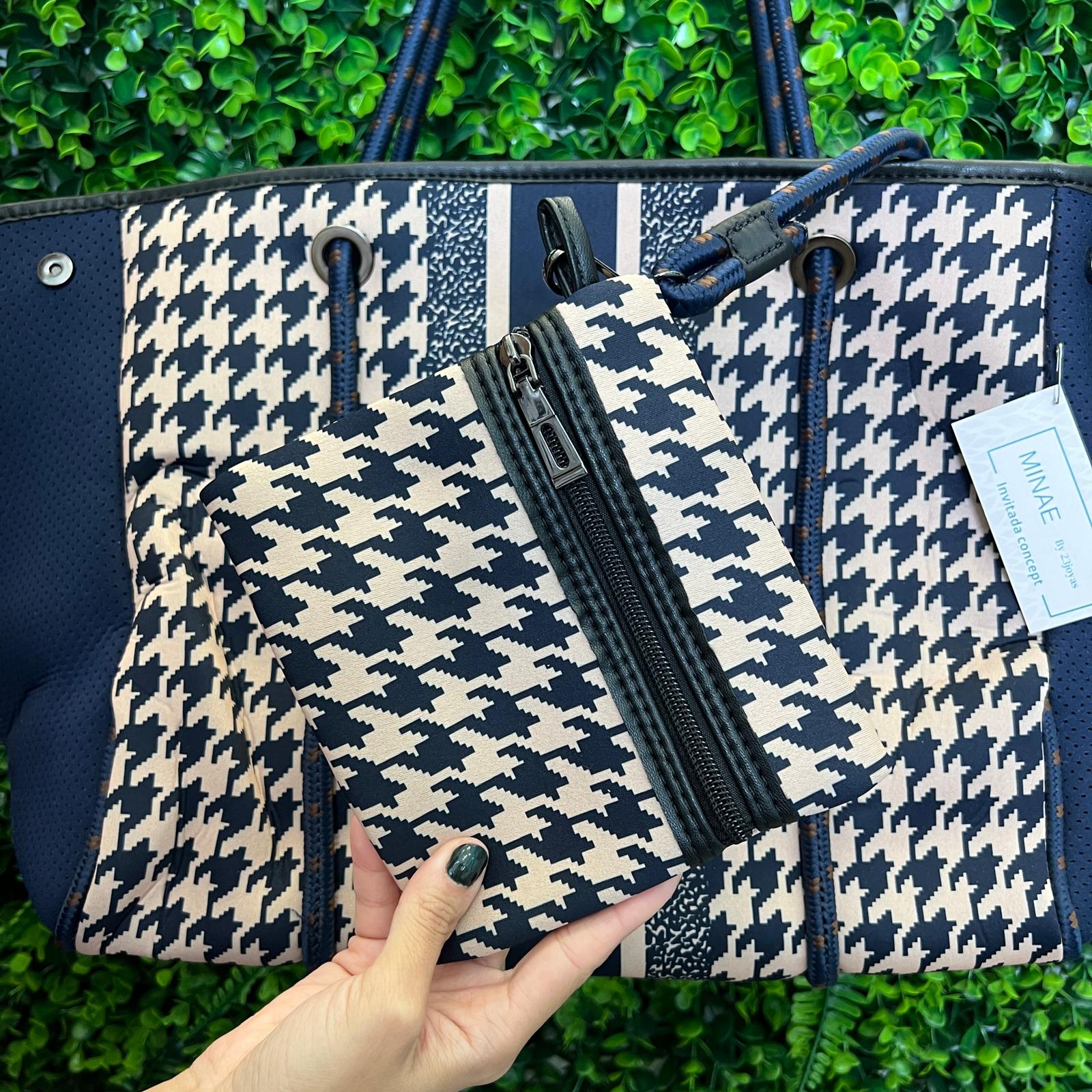 Bolso shopper grande de neopreno. Tiene cierre cremallera y un neceser completamente extraíble, unido por una correa interior del bolso. Se puede hacer todavía más grande con unos corchetes que tiene en los laterales.