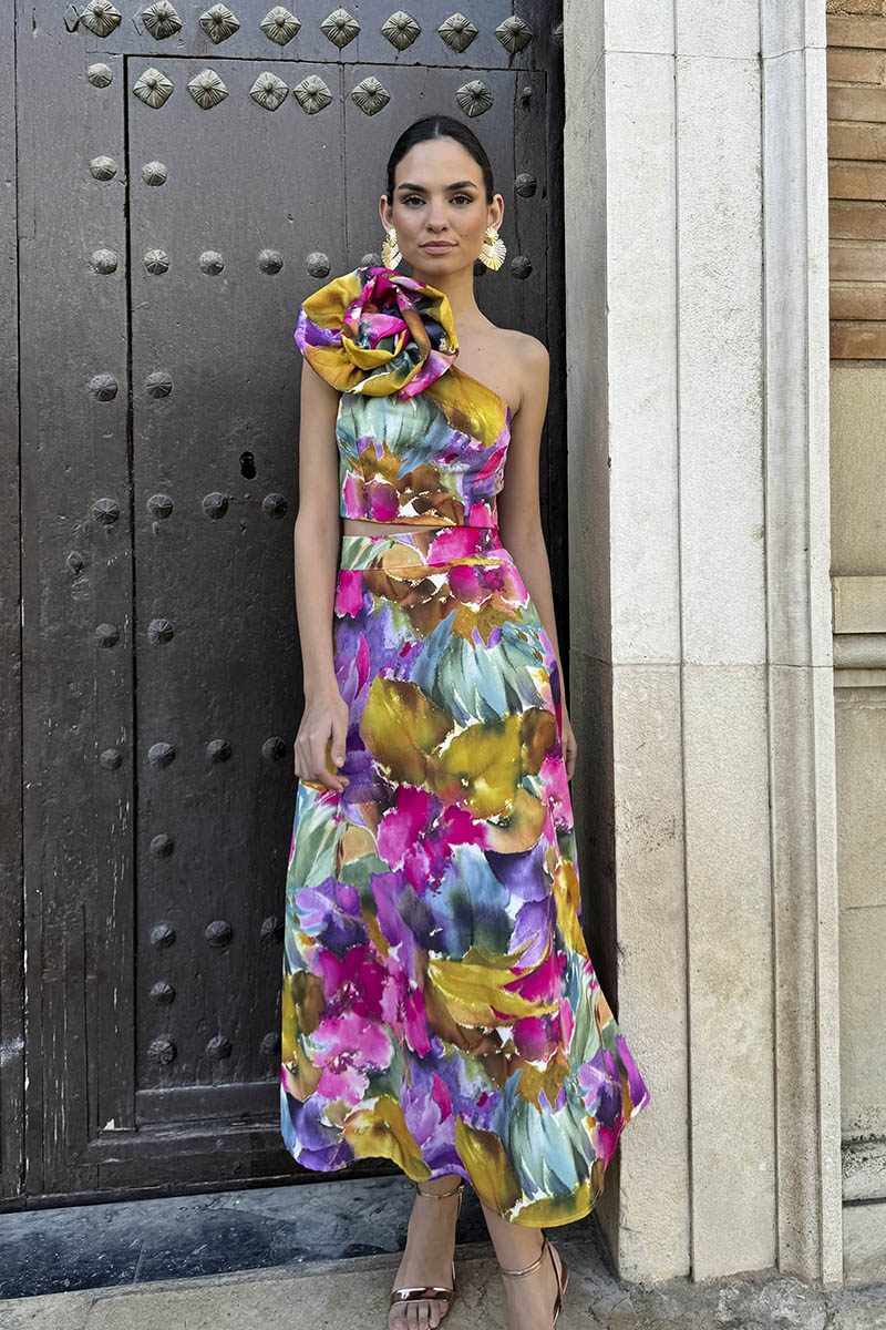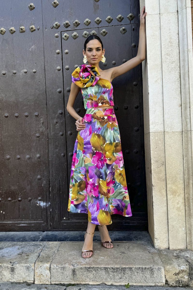 Conjunto perfecto de invitada de boda y evento confeccionado en tejido bielástico estampado. Top asimétrico con detalle de rosa en mismo tejido y cremallera lateral invisible. Falda midi de capa con cinturilla y cremallera invisible lateral.