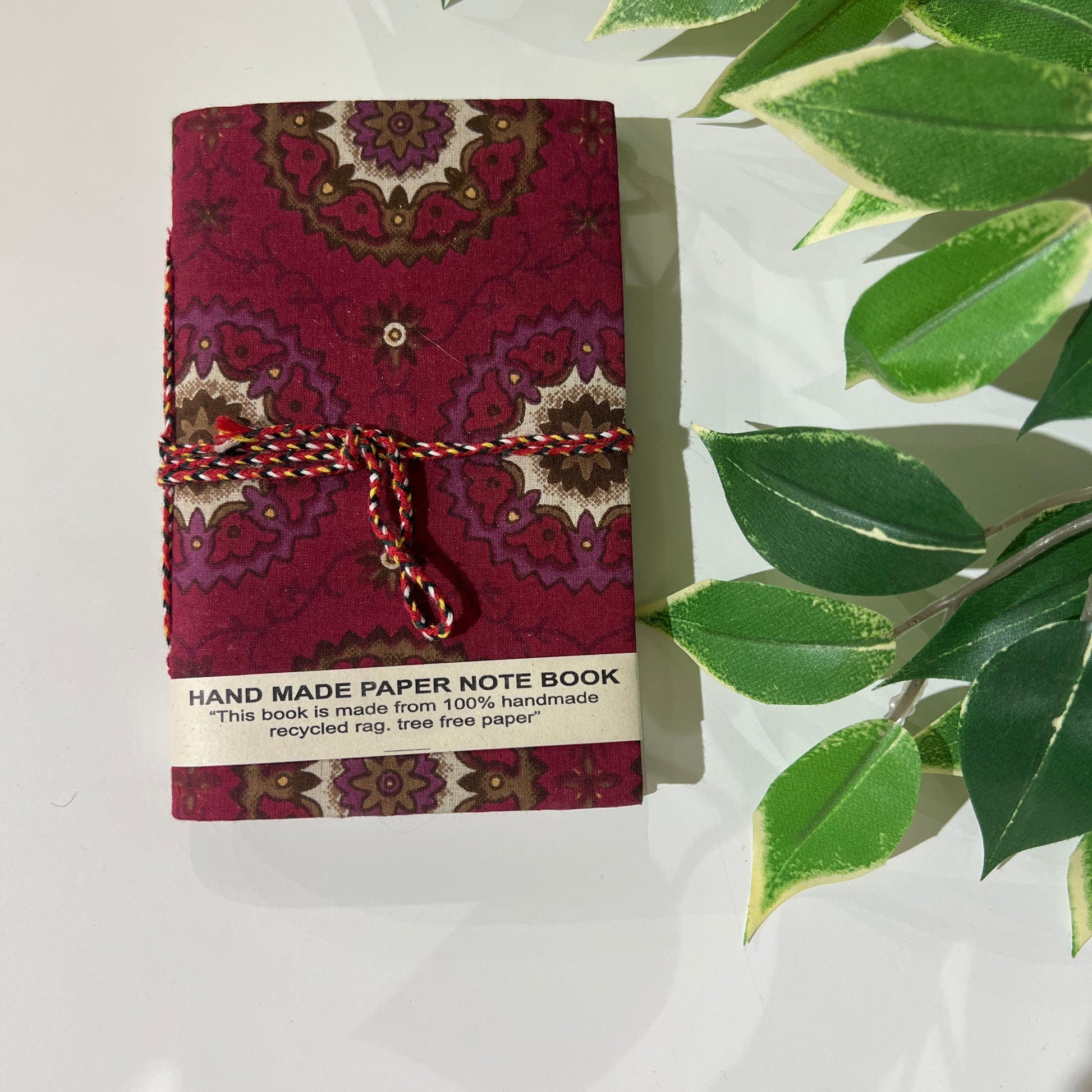 Estas libretas las traemos de la India, están hechas a mano con tela de algodón con estampado block print con tintes naturales. La tela puede tener alguna pequeña imperfección al ser el estampado hecho a mano. El papel es reciclado, también hecho a mano y contiene impurezas lo que le confiere un carácter especial y artesanal.