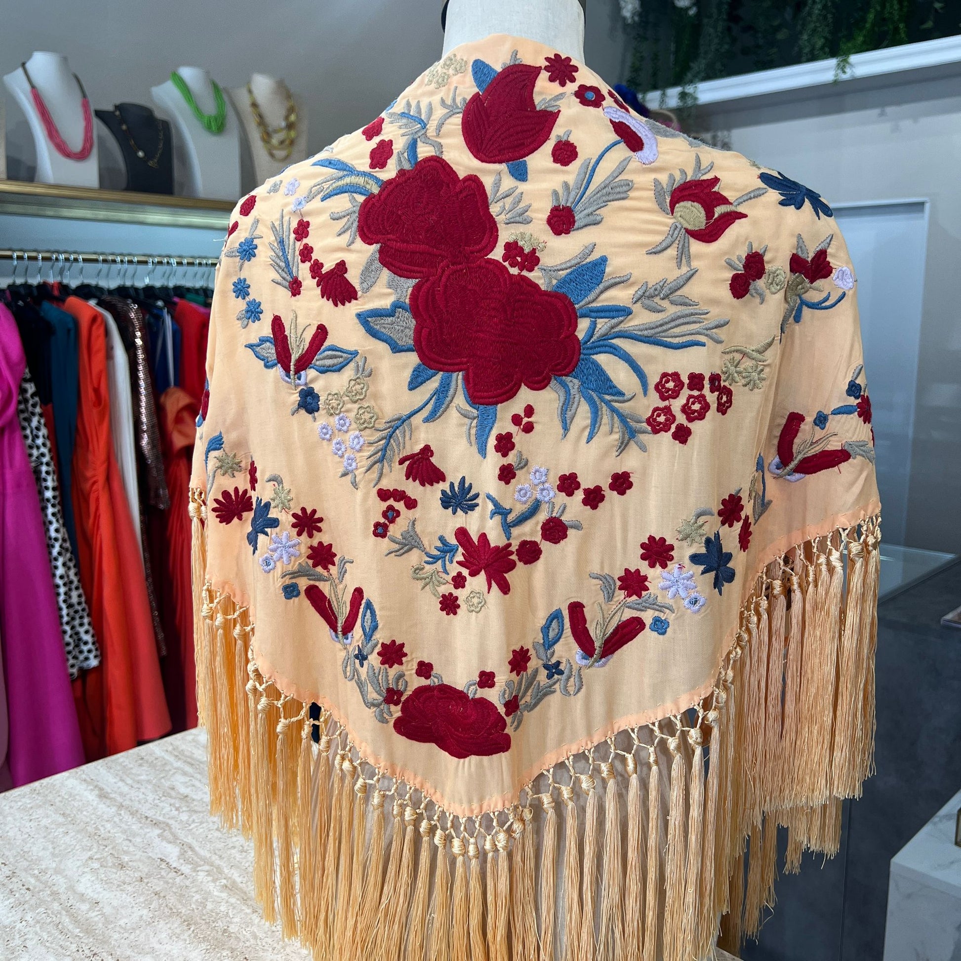 Mantón de algodón bordado con flores en tono rojo. Tiene fleco corto de borlón.