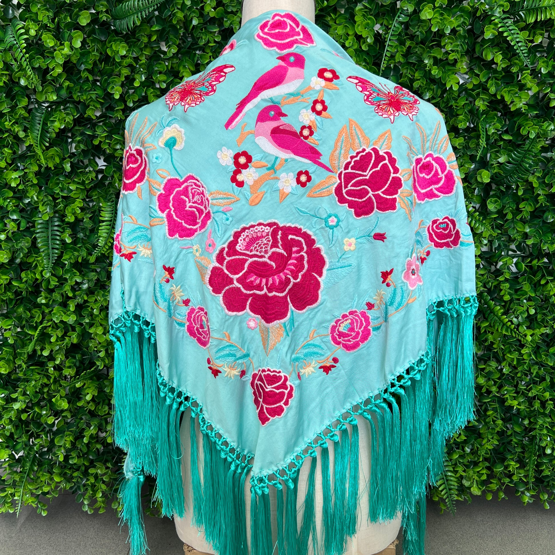 Mantón de seda bordado con flores y golondrinas en tonos rosas. Tiene fleco corto de borlón.